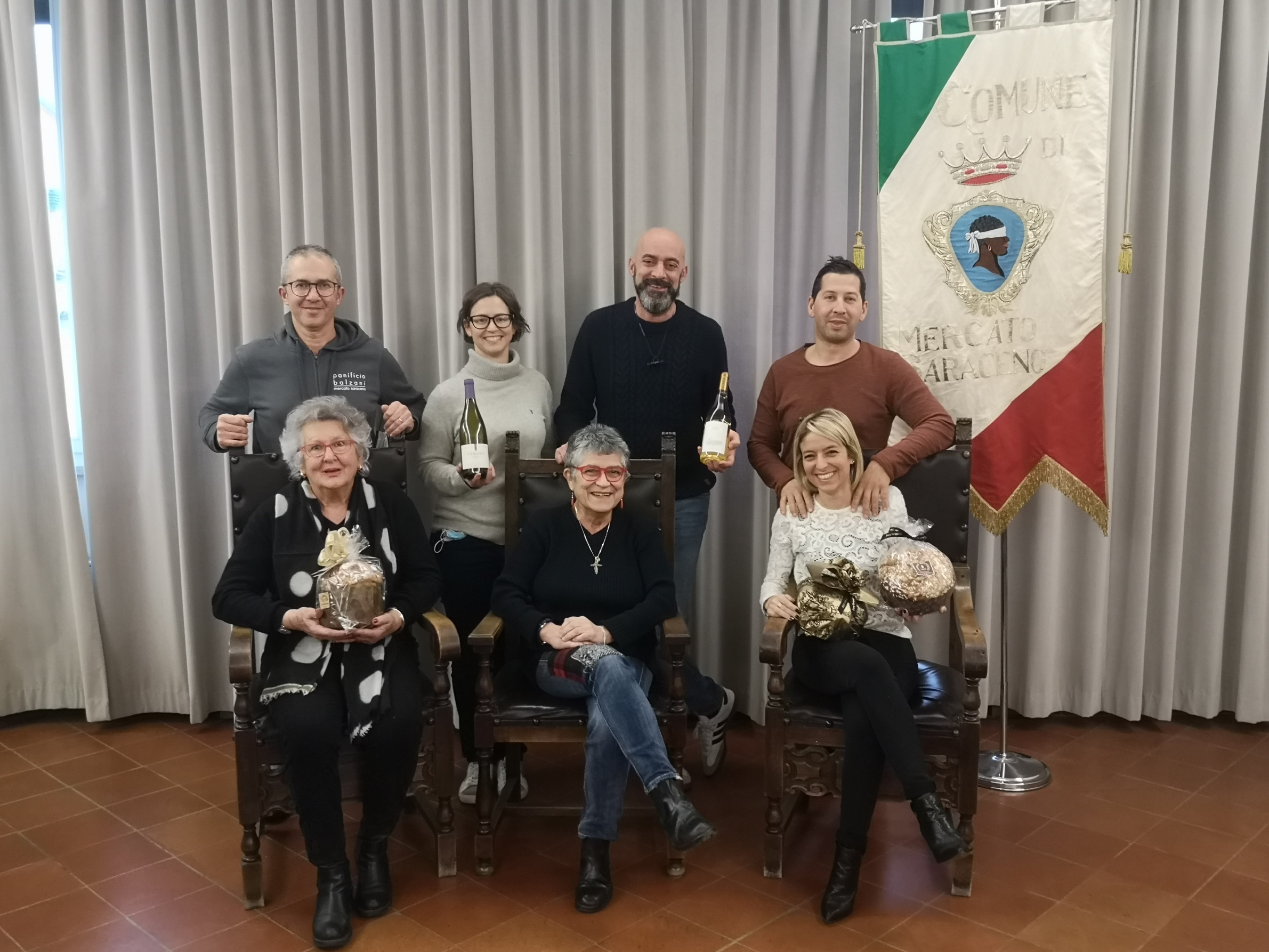 Nella foto, a sinistra, Marco Balzani (sopra) e Fiammetta Pransani (sotto) della Bottega del Pane; al centro Davide Bartolini di Cantina Bartolini e Silvia Casali di Tenuta Casali (sopra) e il Sindaco di Mercato Saraceno Monica Rossi (sotto); a destra Elisa Bertozzi del Forno Bertozzi 1955 (sotto) e il marito Matteo (sopra).