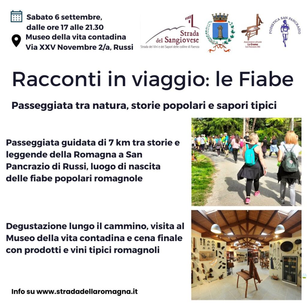 Camminare lungo strade di campagna ascoltando antichi racconti popolari ed entrare in piena sintonia con il territorio gustandone i sapori più caratteristici. E’ la proposta di “Racconti in viaggio: le Fiabe”, passeggiata culturale tra natura, gusto, tradizioni e leggende organizzata dalla Strada del Sangiovese, con il patrocinio del Comune di Russi, per sabato 6 settembre a San Pancrazio di Russi.