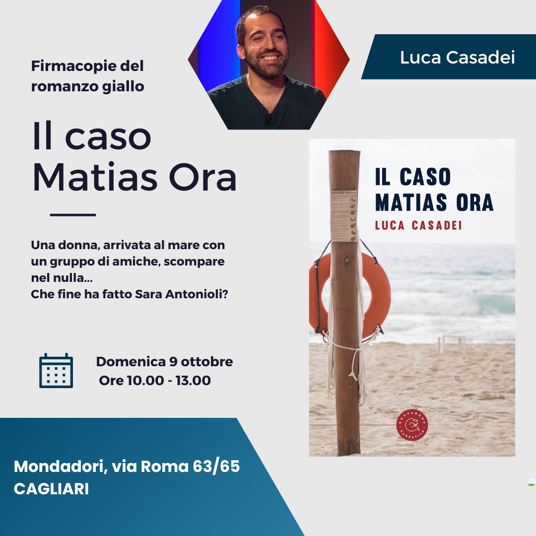 Domenica 9 ottobre, dalle ore 10.00 alle 13.00, alla Libreria Mondadori di Cagliari (Viale Roma 63/65) è in programma un incontro con Luca Casadei, autore del romanzo giallo “Il caso Matias Ora” (Bookabook, 2022), che firmerà le copie del libro e sarà disponibile per rispondere alle domande dei lettori.