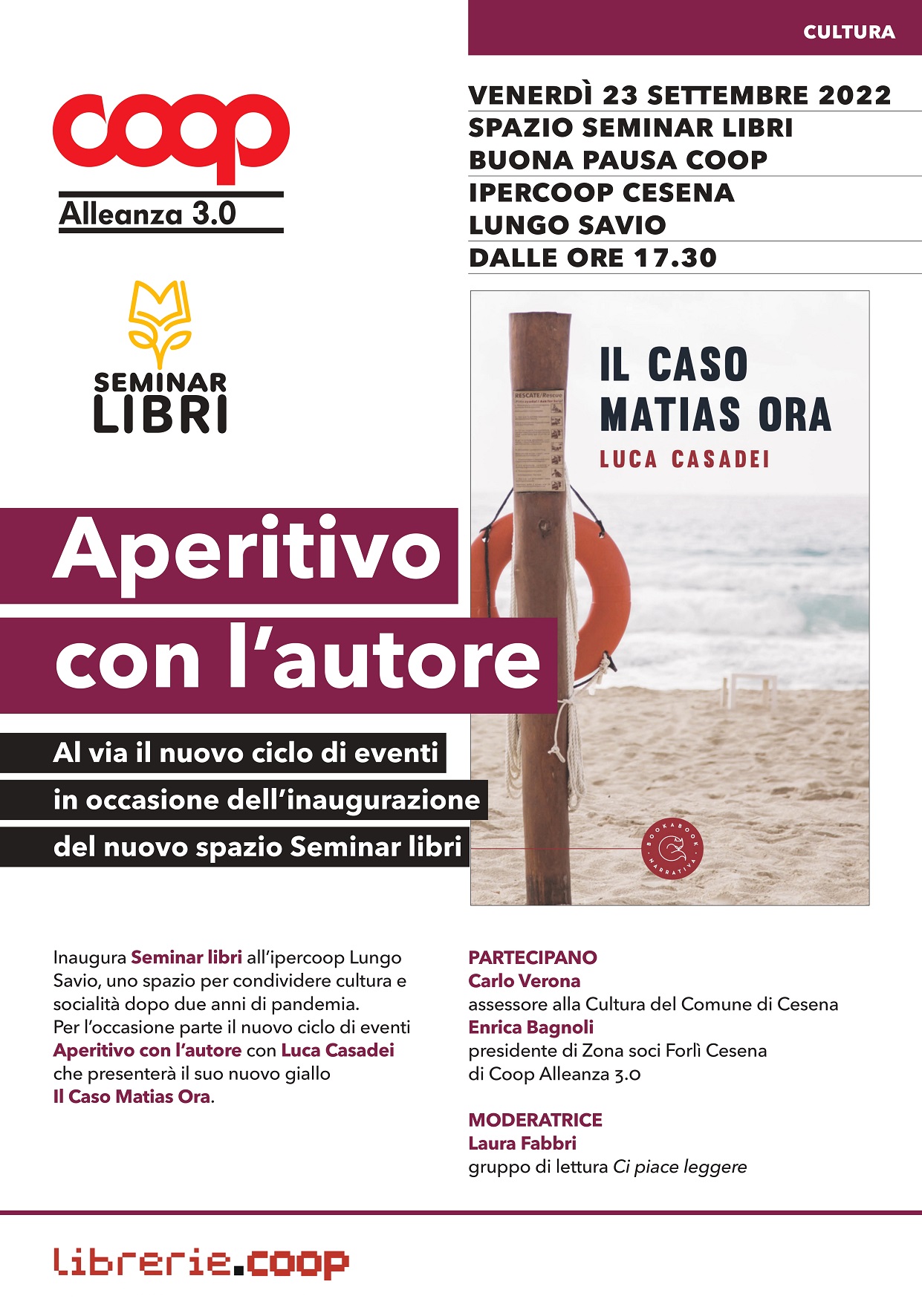 All’evento inaugurale interverrà Luca Casadei che presenterà il suo ultimo giallo “Il Caso Matias Ora”. Saranno presenti all’evento anche Carlo Verona, assessore alla Cultura del Comune di Cesena ed Enrica Bagnoli, presidente di Zona soci Forlì Cesena.